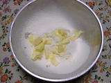 3回ふるった薄力粉と、1cm角に切ったバターをボールに入れます。