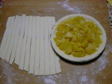 パイ皿の縁に照り用卵を塗ってから格子状にのせる。