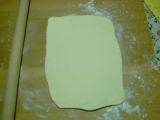 パイ生地をめん棒で長方形に伸ばし、三つ折にする。