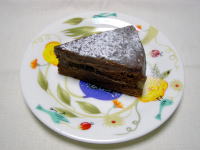| (下準備) 型にクッキングシートを敷いておく。 鍋にシロップ用の水にグラニュー糖を加え、煮溶かしておく。 薄力粉とココアは合わせて振るっておく。 チョコレートは細かく刻んでおく。 スポンジ作り 1 卵は約30度のお湯で湯せんしながら、グラニュー糖を3回に分けて加え、モッタリするまで、 よく泡立てる。 2 振るっておいた薄力粉とココアを加えて切るように混ぜ合わせる。 3 型に流し入れ200度のオーブンで約30分焼きます。 チョコクリーム作り 4 生クリームを鍋に入れて沸騰させて、チョコと砂糖を入れて溶かした後、ボールに移して冷まし、 あら熱が取れたら軽く角が立つ程度まで泡立てる。 5 スポンジの厚さを2等分に切り、シロップを塗ってチョコクリームを塗って重ねる。 チョコを上部と側面にも塗り、冷蔵庫に入れて冷やしクリームを落ち着かせる。 チョコガナッシュ作り 6 鍋に生クリームを入れ、沸騰寸前まで温めて、細かくしたチョコを入れ溶かす。 7 チョコガナッシュが温かいうちにケーキを網の上に置いてチョコガナッシュを掛け、側面にも垂らし 冷蔵庫で冷やします。 参考:いただく前にシュガーパウダーを振ってもよい。 |
