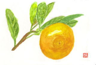 自宅の庭になったミカンを描きました。 去年は26個、今年はたくさん採れることを