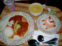 | グランマ・サラのスペシャルセット コーンスープ又はグリーンサラダ チキンソテー、カレー風味のトマトソースバターーライス添え ストロベリーロールケーキ 飲み物のチョイス(1450円) |