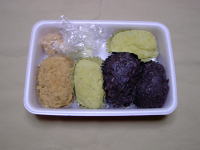左からきな粉のおはぎ、右となりは黄緑色のおはぎ、餡子のおはぎです。