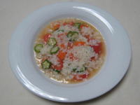 ランチに手早く夏向きのリゾットを作りました。 コンソメ味、トマト入りでさっぱり味です。