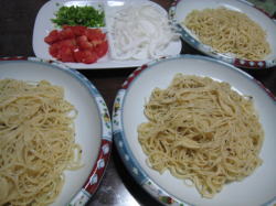 茹でた麺を氷水で冷たくしめると更に美味しくいただけます。