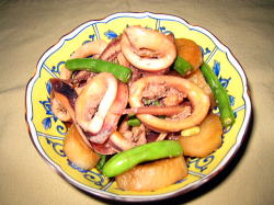 表面が茶色で新鮮なイカ2杯と大根を煮ました
