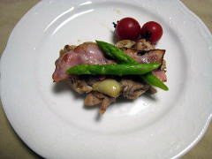 焼き上がりに、お酒を振ると柔らかさが出ます。色とりにアスパラガスを
