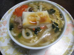 今回は、栄養を取れるように、玉子とじうどんにしてお餅をのせました。 |