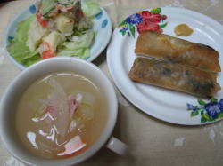 春巻き、自宅でとれたじゃがいものポテトサラダ、冬瓜のスープです。 |