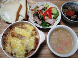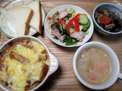 ミートソースグラタン、 生野菜サラダ、煮しめ(常備菜)、野菜スープ