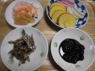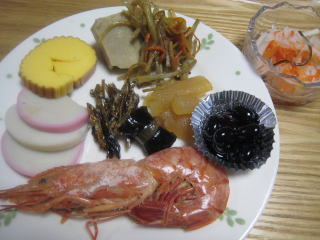 今年作ったもの=エビの旨煮、田つくり、黒豆、紅白なます、里芋の煮物、きんぴら。