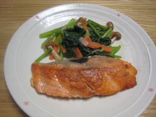 サケのムニエルの付け合わせは、小松菜、しめじ、ニンジン、ベーコンです。
