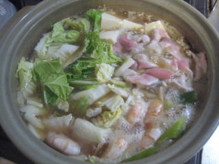タラ、エビ、豚肉、野菜いろいろ |