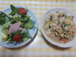 家庭菜園の葉物サラダ・豆腐の煮物 |