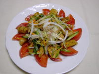 6、器にトマト、ササミ、Bの野菜をのせ、漬け汁をかける。