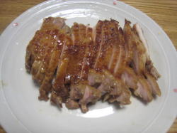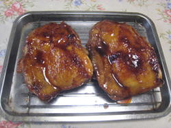 5、焼けたら煮汁を鶏肉に何度もかけて照りをつける。