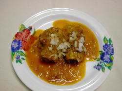 6、器に盛って、残ったトマトソースをかけ、残しておいた玉ねぎを上に飾ります。