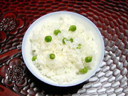 2 グリーンピースは米を炊く水と塩を煮立たせた中でゆで、ザルにあげておく。
