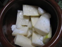 上から塩、砂糖、酢の順に大根にかけます。 |