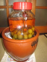 その上に蓋をかぶせ、梅酒の瓶をのせています。 |