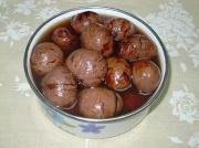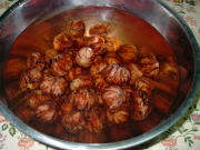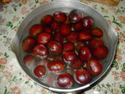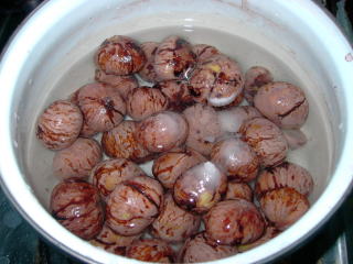 湯が冷めたら、渋皮を傷つけないように、一つ一つ鬼皮を剥きます。 |