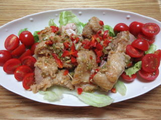 4 食べやすい大きさに切って、器に盛り、熱々のお肉に香味ソースをかけて出来上がり。